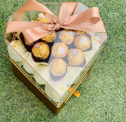 Un coffret cadeau de luxe sous forme de cœur avec du chocolats Ferrero Rocher et de superbes fleurs blanches coupées. Une idée cadeau idéale pour une occasion spéciale.